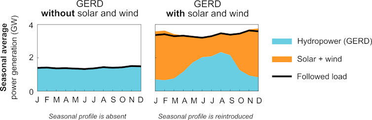 If GERD were operated to back up solar and wind power, this would mean producing less hydropower during the dry season, and more during the wet season, without affecting GERD’s annual average power output. Such an operation would resemble the natural situation.